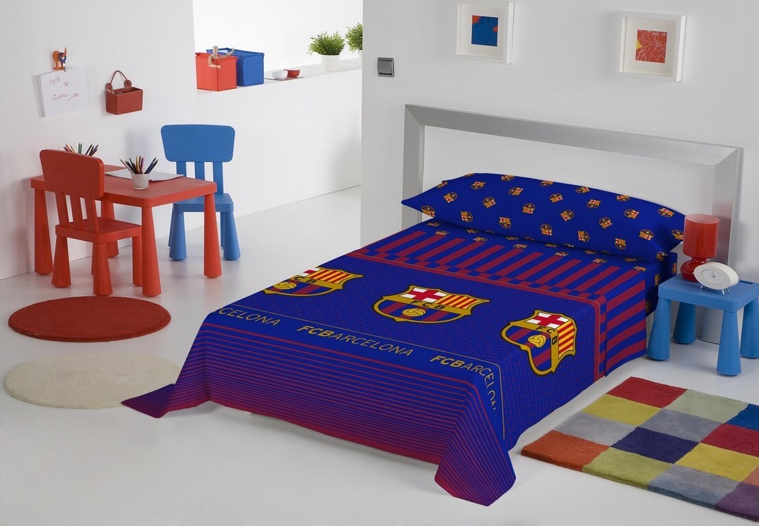 - Dale un toque especial a tu dormitorio con este magnífico juego de sábanas oficial del FC Barcelona. Fabricado en 50% algodón 50% Poliester de alta calidad, este conjunto presenta el emblemático escudo del club y los colores tradicionales azulgrana en un diseño elegante y deportivo.